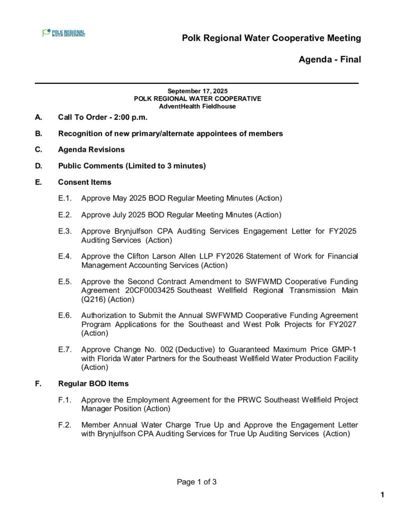 Board of Directors Meeting 9-17-2025 – Agenda